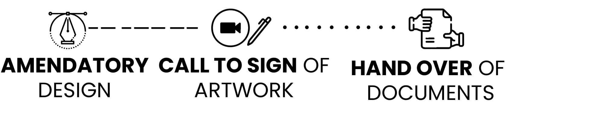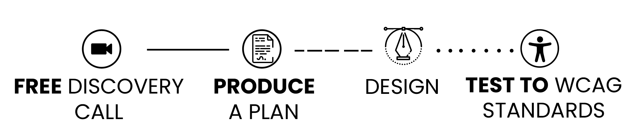 Image Description: A black-and-white workflow graphic showing an accessibility design process: free discovery call, planning, design, WCAG testing, design amendments, artwork sign-off call, and final document handover.